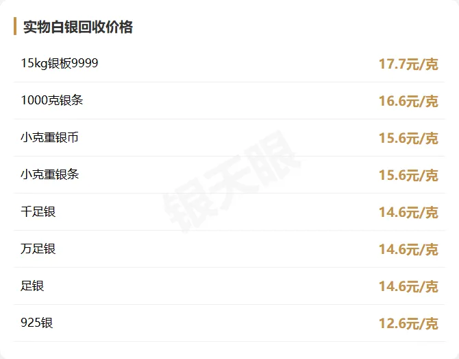 小克重银币、小克重银条以及千足银、万足银、足银饰品的回收价统一为14.6元/克,较标准银条低2元/克