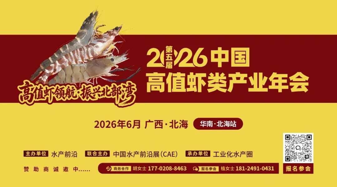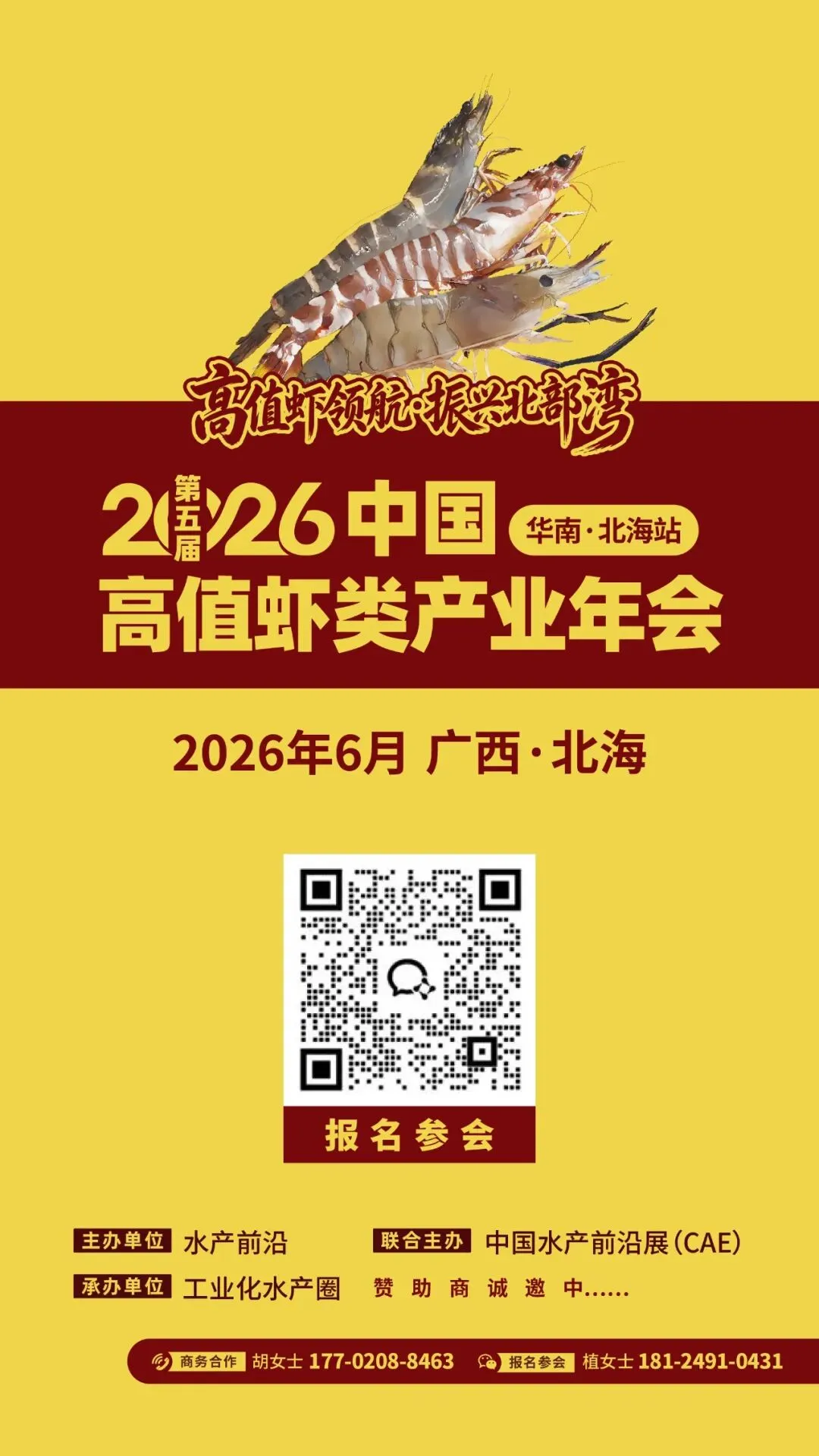 第五届中国高值虾类产业年会(华南·北海站),6月与您相约!据水产前沿4月20日周报,高值虾涨势突出:日本对虾(花虾)涨幅最大,湛江产区周涨5元/斤,30-40条规格达95-105元/斤。罗氏沼虾稳中有涨,肇庆下午虾涨至40元/斤,大虾供应紧张支撑行情。整体看,存塘告急与节日预期正推动花虾、罗虾率先开启涨价通道,高值虾类春天行情显现。