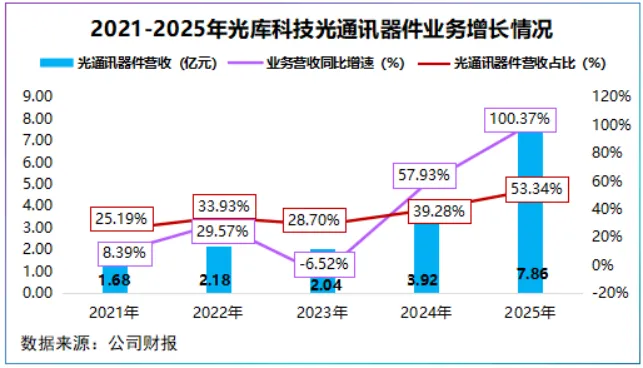 2025年,光库科技光通讯器件营收规模接近8亿元,同比增幅高达100.37%,占公司总营收的53.34%,一举成为公司核心增长主力。
