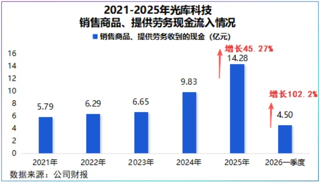 2025年,公司销售商品、提供劳务收到的现金为14.28亿元,同比增长45.27%,2026年一季度同比大增102.2%,再次得到印证。