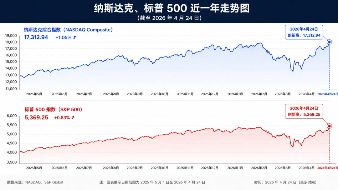 4 月 24 日,一个数字刷屏了所有财经群组——英特尔单日收涨 23.64%,创下 1987 年以来最大单日涨幅,股价突破了整整 25 年前互联网泡沫时期的历史峰值。当日收盘价报 82.57 美元,年内累计涨幅已达 124%。同日,标普 500 指数上涨 0.80% 至 7165.08 点,纳斯达克综合指数上涨 1.50% 至 24836.60 点,两大指数均创收盘历史新高;英伟达市值在盘中尾声重新站上 5 万亿美元大关。芯片股全线沸腾,市场情绪迅速蔓延。问题随之而来:这一次,AI 行情的"第二波"真的启动了吗?