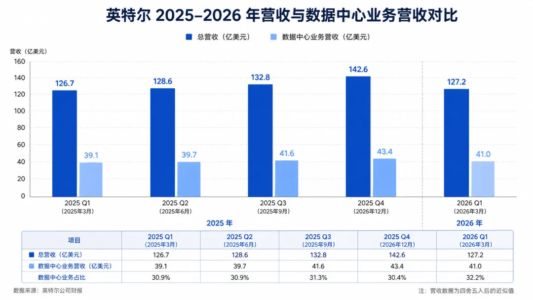 英特尔 2026 年第一季度非 GAAP 每股收益为 0.29 美元,大幅超出华尔街一致预期的 0.01 美元;营收录得 136.0 亿美元,较市场预估的 124.2 亿美元高出约 11.8 亿美元,AI 驱动业务收入同比增长 40%,非 GAAP 毛利率达到 41%,且这已是英特尔连续第六个季度超出自身业绩指引。