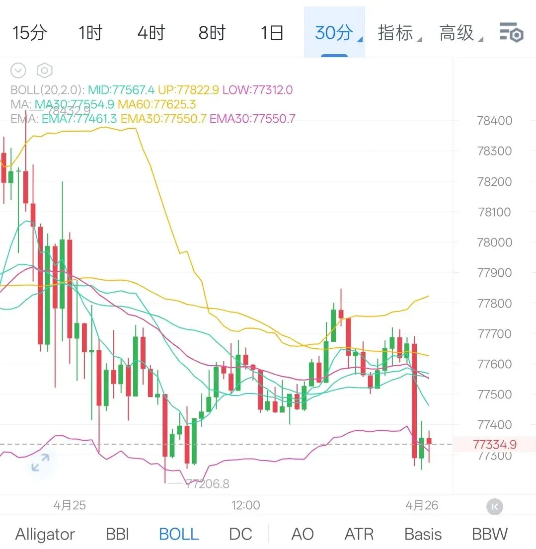 从磐面结构来看,日线级别大饼在连续上行后进入高位整理阶段,行情未能进一步刷新有效高点,短期动能有所放缓,属于上涨后的修正阶段;四小时级别是当前关键,大饼已经出现相对清晰的高点下移迹象,上方从78000上方回落至77800一带形成压制区,反弹高度逐步降低,同时下方低点在77200一带反复被测试,说明支撑在被持续消耗,结构开始向偏空倾斜,但尚未形成明确破位。一小时级别则表现为震荡偏弱运行,反弹多为技术性修复,缺乏趋势延续。以太四小时同样呈现高点缓慢下移、反抽乏力的特征,结构与大饼一致。综合来看,当前行情处于高位震荡向弱势过渡阶段,操作上思路需要明确偏空对待,但不追空,依托反弹参与更为合理,一旦四小时级别有效跌破,行情才有望打开新的下行空间,届时空头延续性会更强。