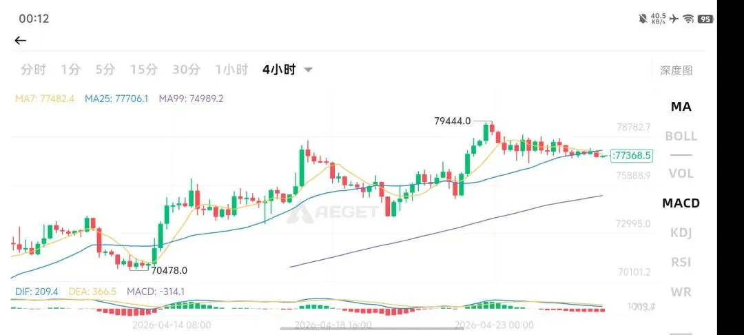 · 移动平均线:当前价格运行在MA7(77482)与MA25(77706)之间且略低于二者,但MA99(74989)仍远低于当前价格,中长期均线尚未被破坏,说明日线级别的上升趋势依然完整,当前应定性为"上涨趋势中的回调蓄势"。【文件内容†L5-L8】