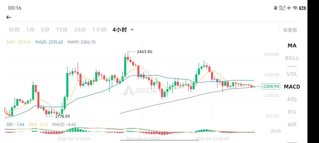 MACD死叉继续压制,上方MA25构成反压,下方$2,300–2,280有反复测试的可能。