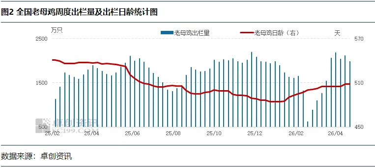 4月鸡蛋价格大幅拉升,下旬主产区均价最高上涨至3.97元/斤,较月初涨幅超20%,养殖端盈利好转,单斤鸡蛋盈利提升至0.50元以上,盈利好转延缓了老母鸡淘汰节奏,月末老母鸡出栏日龄较月初延后3天,对价格形成一定支撑。