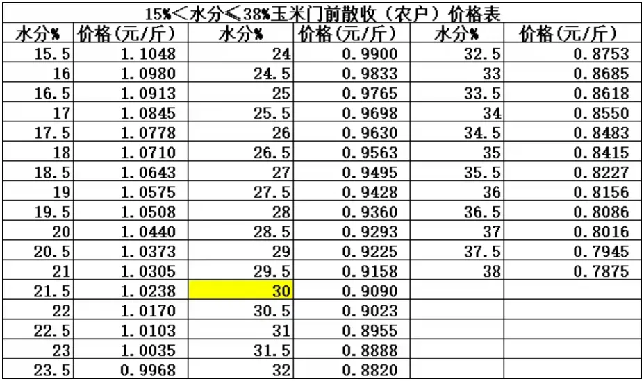 2.门前“带票”价格:新粮14%<水分≤15%三等及以上玉米折标价格为2290元/吨;15%<水分≤38%玉米折标价格为2260元/吨;该价格为筛混不返杂价格;需提供发票(9%税率);发票入账后10个工作日内付款。