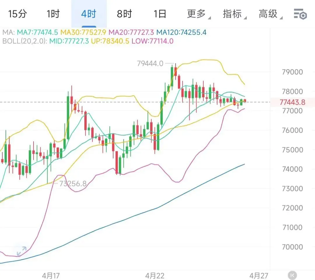 当前盘面来看,日线目前回调后还是处于高位整理的阶段,多空大方向尚不明了,短期的支撑结构还是关注77000一线以及120日均线位置,而上方的关键压制还是79500-80000关口。指标上调整后需要关注macd快慢线粘稠后得到死叉能否带动行情进一步的走低,否则多有占据主导后还是有可能向上冲高放量。四小时图就是很标准的调整蓄势的形态,多头强势收复的阶段随着中轨的破位,周末再次走出顶底的信号,后市还是有进一步向下调整的空间,指标上目前顶背离已成型,后市还是继续关注空头放量的量能,操作上还是主空思路不变。