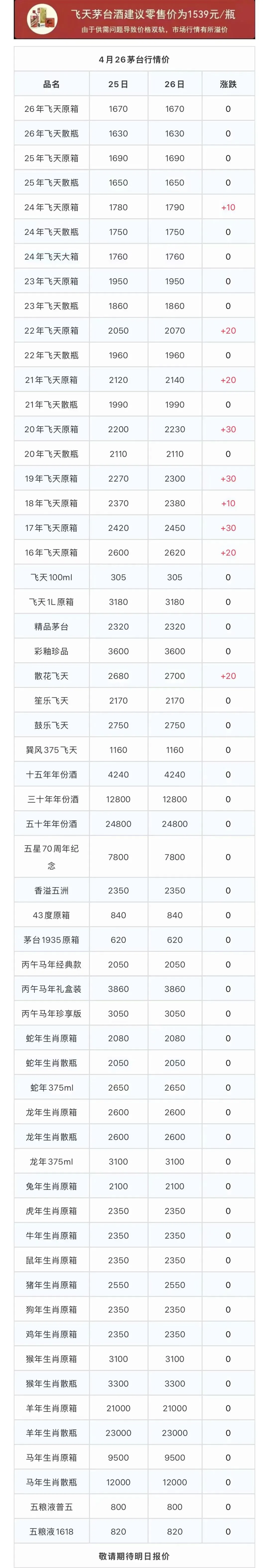 4月26日飞天茅台最新行情——飞天全线上涨!