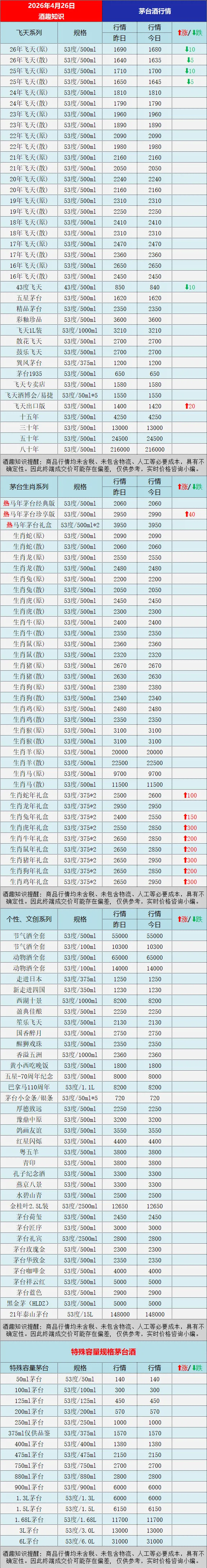 今日茅台酒行情价格参考:飞天系列,2025-2026年飞天原箱、散瓶下跌,43°飞天同步下跌;飞天出口版、马茅珍享版大幅涨;茅台12生肖礼盒系列,全线大幅上涨。更多茅台系列酒具体行情参考下文图表:《酒趣知识》温馨提醒:商品信息均未含税、未包含物流、人工等必要成本,具有不确定性。因此终端成交价可能存在偏差, 仅供参考,实时价格咨询小编。注意:茅台等品牌老酒价格小幅波动频繁,老酒受品相克重影响价格差异大,同时不同地区价格有几十元不等的差价,最终以实际成交价格为准!《酒趣知识》多媒体平台同步给您带来茅台酒及时行情参考,同步深挖茅台、五粮液、汾酒等各大名酒资讯,为酒友奉上客观的价格参考与专业的行业解读,让大家用酒有价可依、避坑无忧。丨声明:部分图文来源于网络,版权归原作者所有,如涉及版权等问题,请及时与小编联系删除或修改。