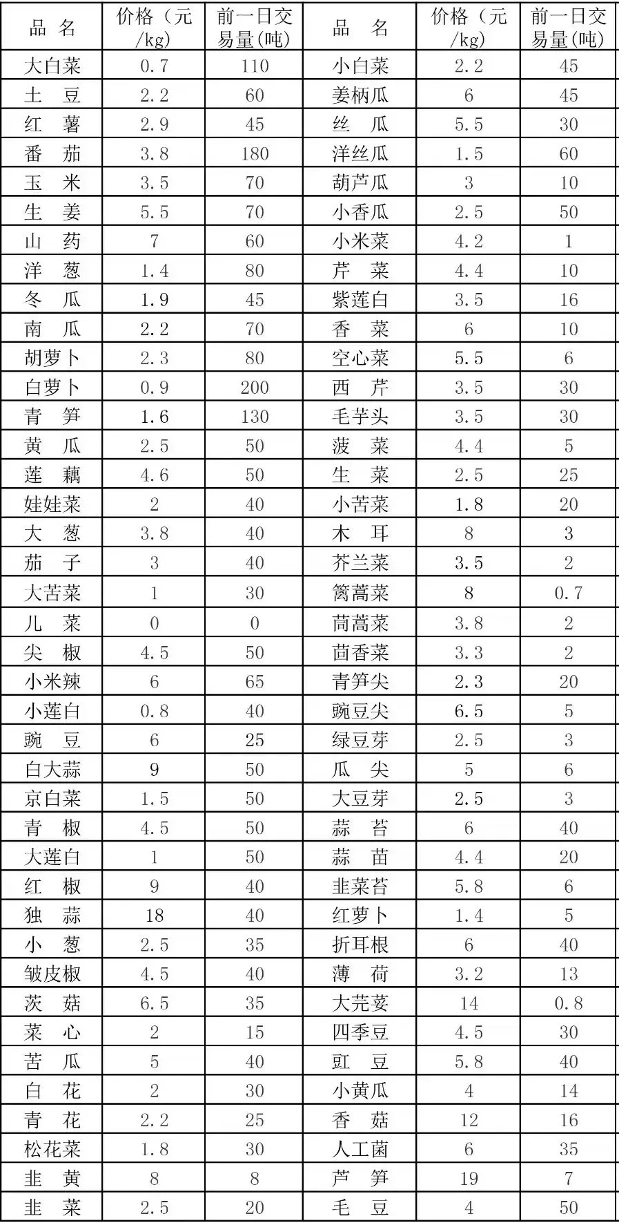 昆明王旗营蔬菜批发市场价格(元/公斤、吨)