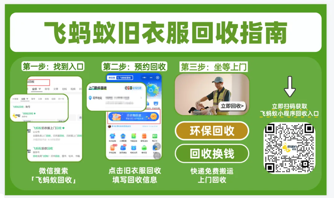 别让闲置衣物占据空间,立即预约飞蚂蚁回收,让旧物变现,为环保出一份力。