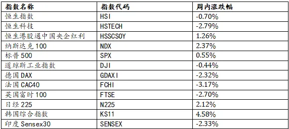 本周海外权益方面,全球市场表现分化,日韩股市走强,港股和欧洲市场下跌,美股表现较强。