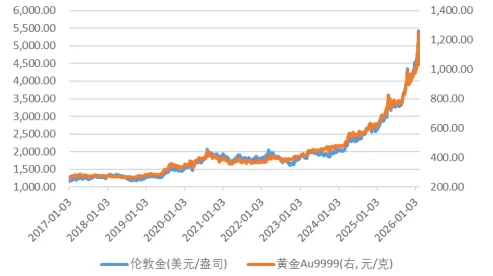 截止本周,伦敦现货黄金收于4704.74美元/盎司(周环比-2.74%),国内AU9999黄金收于1033.25元/克(周环比-1.75%)。