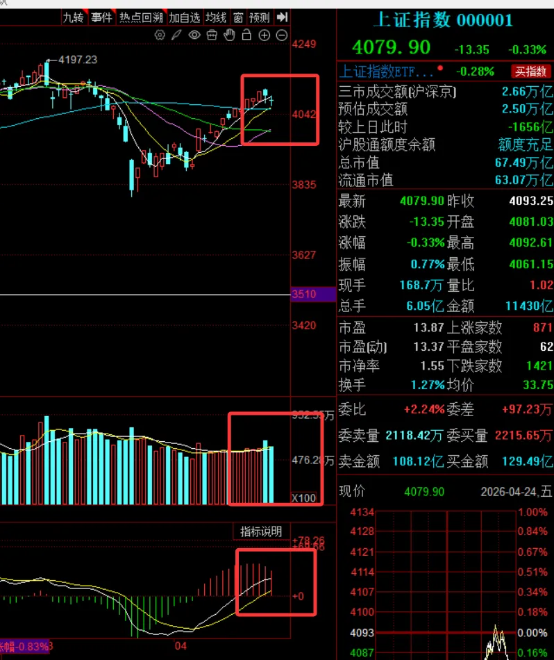 回顾周五指数,沪指早盘低开低走,整个上午盘低位运行,午后开始震荡伤心,一度翻红,最终小跌收绿,三大股指齐跌,创业板指收跌1.41%,能源金属,化学化工涨幅居前全天2035家上涨,3352家下跌,81家涨幅超9%,203家涨幅超5%,56家跌幅超9%,241家跌幅超5%,整体亏钱效应明显。截止收盘,沪指收4079.9 跌0.33%,深成指收14940.30 跌0.69%,创业板指收3667.79 跌1.41%,两市成交2.63万亿,连续两日成交量超2.5万亿。板块方面,领涨方向 能源金属大涨超6%,盐湖提锂,农化制品,化肥等涨幅超2%,氟化工,磷化工,电池,钛白粉,半导体等涨幅超1%领跌方向,油气开采,电力,军备,电源设备,影视院线,猪肉,光纤概念等跌幅均超2%锂电池概念:温州宏丰,怡达股份,杰华特,天华新能,三达膜涨幅超10%,万顺新材,佛塑科技,司太立,维科技术,江特电机,丽岛新材,山东赫达,恩捷股份,鼎盛新材,科大制造,西藏珠峰,泰坦股份,多氟多,金圆股份,华源控股,海顺新材,涨停算力租赁:中嘉博创,合众科技,智微智能,浙数文化涨停芯片概念:富瀚微,华特气体20cm,优讯股份,华虹公司,美利信涨幅超10%,固高科技,禾盛新材,盛视科技,衢州发展,深圳华强,综艺股份涨停周五市场,整个亚太市场除了台湾加权指数受半导体产业爆炸性拉高 其他的指数基本表现略为疲软,恒生指数,日经指数,韩国综合指数基本都是弱转强的走势;低开高走,A股也是不例外,一度跌到4060附近,尾盘探底回升,由于时间窗的问题以及业绩集中披露期,资金选择较为谨慎。其次就是近期美元指数不断增强,再次来到99附近,抑制人民币升值通道,自然北向资金选择较为谨慎,美伊二轮谈判扑朔迷离,在连续性上涨之后短调也是理所当然。再个就是近期国际原油再次登上100美元以上,地缘局势反复都是抑制指数上行的重要信号。技术面,周五收取一根十字星的阴K,回踩60日线,短期均线也是依托10日线,那么近期先关注4060这个位置的有效性,量能维度目前继续维持2.5万亿以上,也是能支持指数上行和见顶的可能性,MACD动能柱略微减弱,这些指数都会出现随时反转的可能;以上总结,明日观察指数是否能再次反包前两日阴柱,站上4100点,如站上即可能继续往上试探4140附近前高;如近期有下破4060附近的低点,那么本轮反弹高点随时可见;继续维持观察 ,来是否继续跟进资金进场1.周五晚间美股纳斯达克指数大涨1.63%,再创历史新高,明天开盘基本是定数的。2.英特尔周五晚间大涨23.6%,带动整个半导体市场大地震;明日CPU+半导体设备将会是市场主要炒作方向;3,三星在韩国的芯片生产因罢工下降58%,存储芯片预计还会继续强者恒强4.华为DCS AI解决方案全面支持DeepSeek-V4 华为产业链不排除依旧可以走出一波行情指数角度,明日我认为指数会选择高举高打,再上4100点试探,毕竟全球股指除了沪指好像都创新高了,总得跟上节奏,其次进入年报和第一季度报尾声,该披露的也基本都披露了,开启新一轮的行情也不是不可能;只要没有突发性事件,我认为指数开启新一轮的行情是非常有可能的。1.半导体设备:近期资金开始围绕半导体走出第二轮行情,市场资金开启由GPU转向CPU,那么核心设备将会得到资金的全面抬高,周五已然是有动作了,明日还将继续维持低位股的补涨。2.储能 这个方向进入第二季度将会是主要炒作方向,能源金属持续新高已经说明了一切;