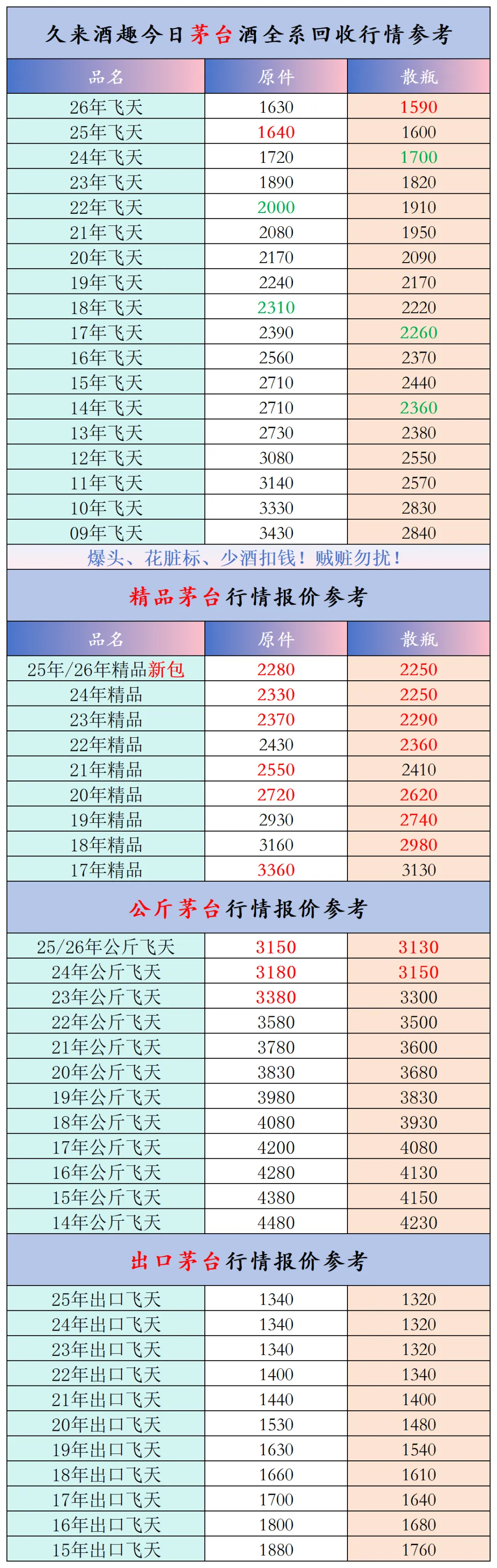 本公众号提供各种名酒回收行情报价,常规茅台、五粮液、洋河、剑南春、国缘等。所有报价根据市场买卖行情总结而来,每天更新最新报价!部分酒水每天涨跌幅较大,无法及时更新请谅解。本报价仅供参考,并非实际成交价格。感谢您的关注!我们会竭尽所能,提供更多更好的服务。