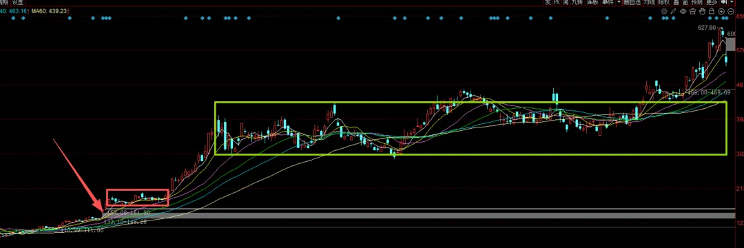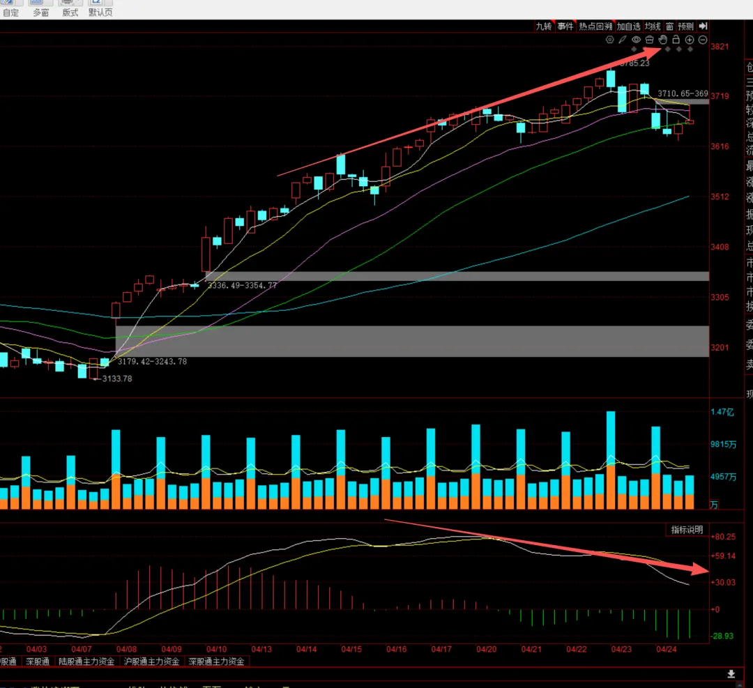 对于新龙东山精密,可以参考去年的新易盛。红色箭头是业绩跳空涨停启动,随后是一个窄幅横盘到20日线启动二波,随后是一个半年的高位震荡。所以这里东山精密需要观察的是,横盘或者小幅度回踩到10日和20日均线的反弹力度,这里不能回踩太深,然后迅速创出新高,这才是二波的节奏,否则就是一个月度级别的调整,目前看3个月左右,等待2季报看一下新易盛这些有吹哨人迹象的股票,业绩能否反弹,如果持续下滑,就要考虑行业是否见顶的问题。