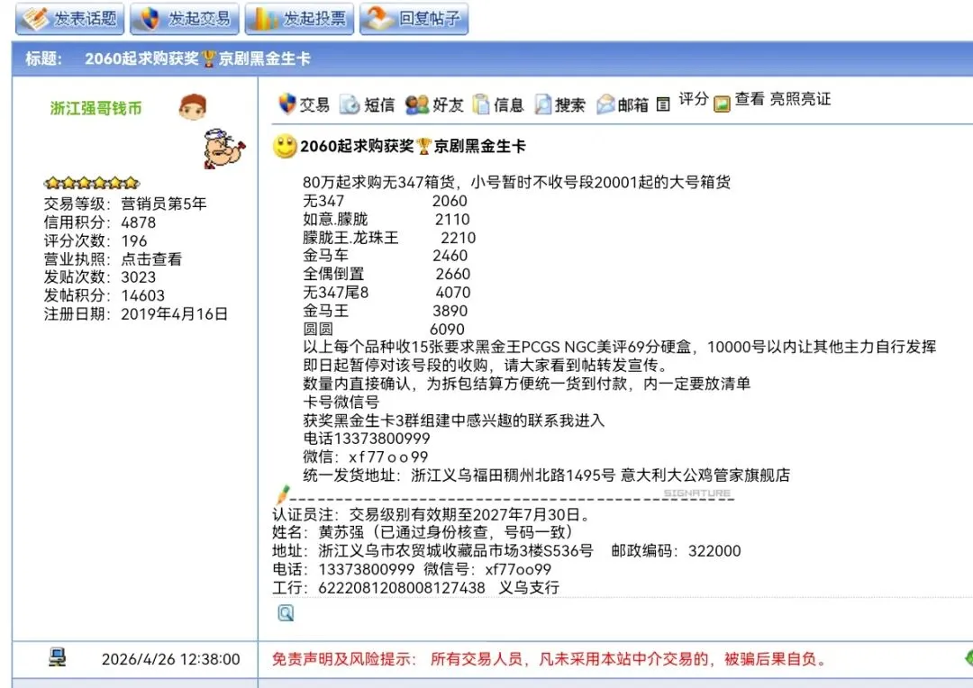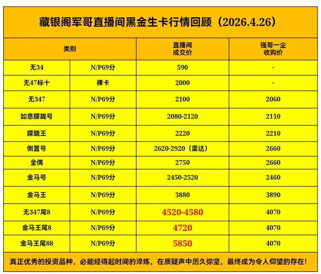 >2026年4月26日获奖纪念黑金生卡行情播报