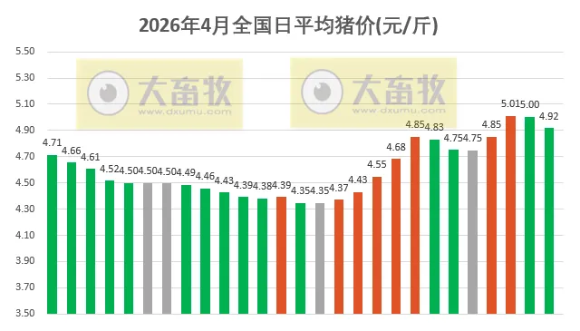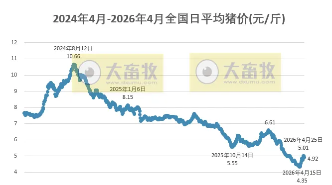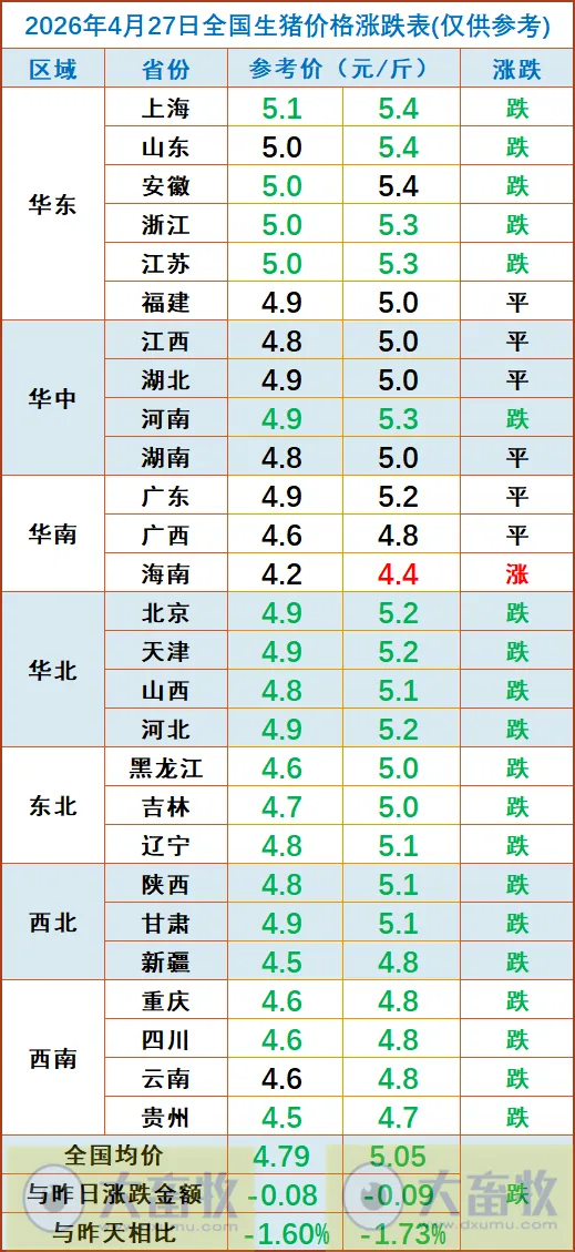 大畜牧小编根据我国27省的猪价数据,计算出2026年4月27日全国平均猪价为每斤4.92元,比昨下跌0.08元,跌幅为1.66%,继续下跌,跌幅扩大,再次进入跌破5元大关,为近3天最低价;
