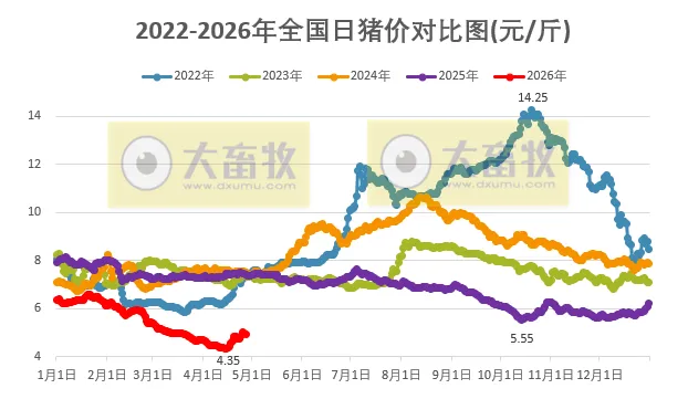 与去年同一天相比,猪价下跌了2.50元,跌幅为33.7%,且低于前6年同期;
