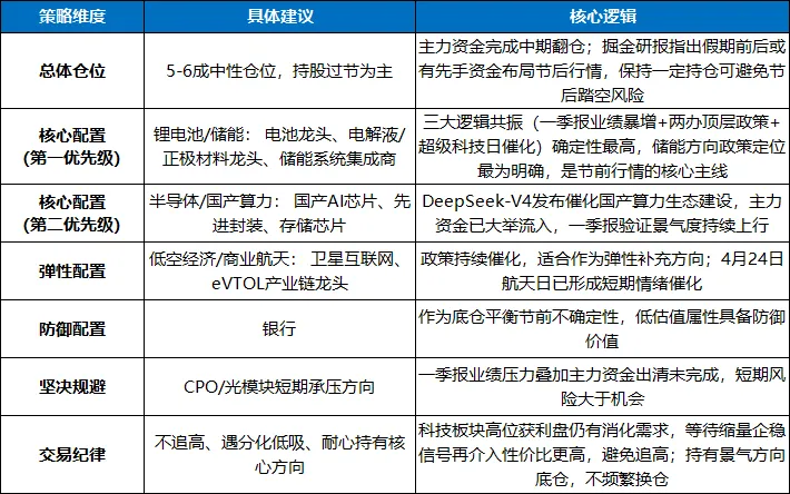 周五两市成交2.62万亿,仍处历史高位。截至4月24日,融资余额为26958亿元,虽有放缓但整体稳定。一方面,"五一"长假临近,部分资金存在"持币过节"的避险需求;另一方面,主力资金本周已完成向锂电、半导体等方向的明确翻仓,结构性做多意愿依然明确。节前最后三个交易日,市场可能呈现"指数稳、个股分化——主线坚挺、边缘承压"的格局。掘金研报也明确指出,不排除假期前后都会有先手金进场布局节后行情,因此持股过节仍是相对稳健的选择。