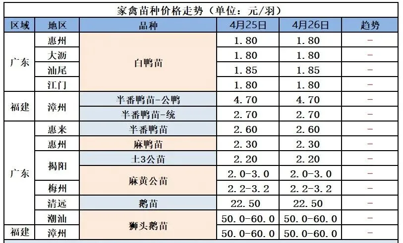 2026年4月27日鸭苗价格行情:(单位:元/羽)