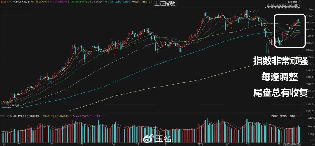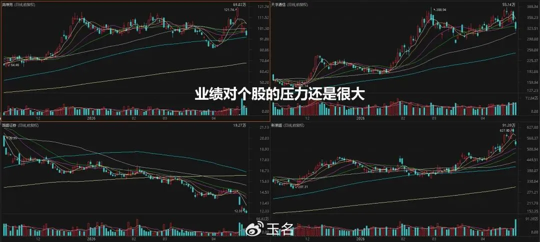 从指数角度,下周还有回踩,60-120日线还是有支撑,所以指数很可能保持高位;但“指数涨、个股跌”的现象,通常意味着市场表面光鲜,实则暗流涌动。业绩暴雷会成为调整的重灾区,前一天股价创历史新高的英-维-克,因业绩不及预期(归母净利润同比暴跌81.97%,经营性现金流大幅转负、毛利率持续下滑,叠加连续多季度业绩不及预期,彻底击穿市场高增长预期。)出现一字板跌停。随后天孚-通信、国盛-证券等诸多品种都是因业绩而跳水,所以个股的风险依然较大。