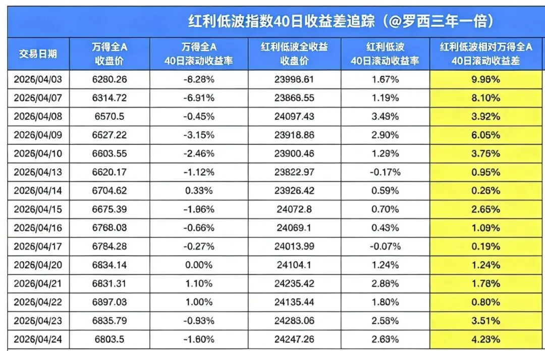 在这个量化当道的时代,量化只会做“锦上添花”的事情,绝对不做“雪中送炭”。发动热点,怼热点,机构跟风,散户买基金继续跟风,造成一种极致分化结构性行情。怼权重龙头,不仅拉高了指数,营造了牛市氛围,而且权重龙头都是经过市场厮杀之后的“胜者为王”,财务和基本面相对来说过硬,没有政z错误。如此极致的我循环,才造就了这种极致分化的“二八”行情。你可以经常看到,指数是红的,量能还是放大的,但是个股又是3600只下跌的。在3月28日中东战争的风声鹤唳下,三大指数也瞬间大跌,可是4月反弹,创业板反而创了近4年新高,距离历史新高也只有一步之遥。宁德时代(19.72%)+阳光能源(4.27%),权重合计占比23.99%; AI算力产业链:中际旭创(9.32%)+新易盛(7.54%)+天孚通信(2.54%)+胜宏科技(2.92%),合计占比22.32%; “七姐妹”总权重:50.96%(占创业板指数超半壁江山)。指数每天都怼这几只权重,其他板块,或者说创业板的其他个股涨幅真的很有限。我们统计3月以来,到本周五,下跌个股4145只,上涨的只有1361只,也就是说在这波反弹里只有24%是上涨的,76%的个股是下跌的,更遑论跑赢指数了。我们再来看看自2025年8月22日上证最近一次有效站上 3800 点以来。3800点以后,从去年8月指数β行情已经结束了,而到了体现你选股和使用策略的能力了。如果你不会选股,那你得会资产配置,或者使用策略来跟随市场,跟上指数,不然一场牛市又是一场空。我天天说到的三个策略,其实对应的就是我们所说的三种投资模式:1、趋势量化投资(立足于过去图形数据):下面年化收益率16%投资模型就是这一类。利用红利低波100与中证全指40天收益率的差额值,来量化出“择时”,一年出手几次,做几个波段,收益率可观。2、资产配置投资(立足于当下):利用股债商的比例配置,当超过某个阈值时,需要动态平衡,这个也是值得散户学习的投资策略。3、基本面价值投资(立足于未来现金流折现):通过跟踪个股和板块主题指数,当低估时直接买进,高估时卖出,需要一直跟踪运行和估值情况。比如我天天跟踪的江山,去年年底卖出的数字经济ETF、科创50ETF,现在持有的生物医药ETF、食品消费ETF等等。 1、前面公布的年化收益率16%的投资模型必须关注“红利低波对中证全a指数40日收益率差额”。以后还会不定期公布一个大盘温度值指标,“钟摆指数”。仓位=100%-钟摆指数。0~30%低估区,可以积极布局;30%~70%合理区;70%~100%高估区,可以根据自己的风险偏好,按策略卖出。2026年4月公众号推送逻辑,如果您觉得可以,请大家多多转发,请点一个“在看”,我的消息会第一时间推送给您。本人深耕雪球13年,有自己的估值标尺,有自己的投资体系,不追求暴富,能稳定盈利,来公号寻找同频的您。2025年的4000点:为何如此静悄悄?