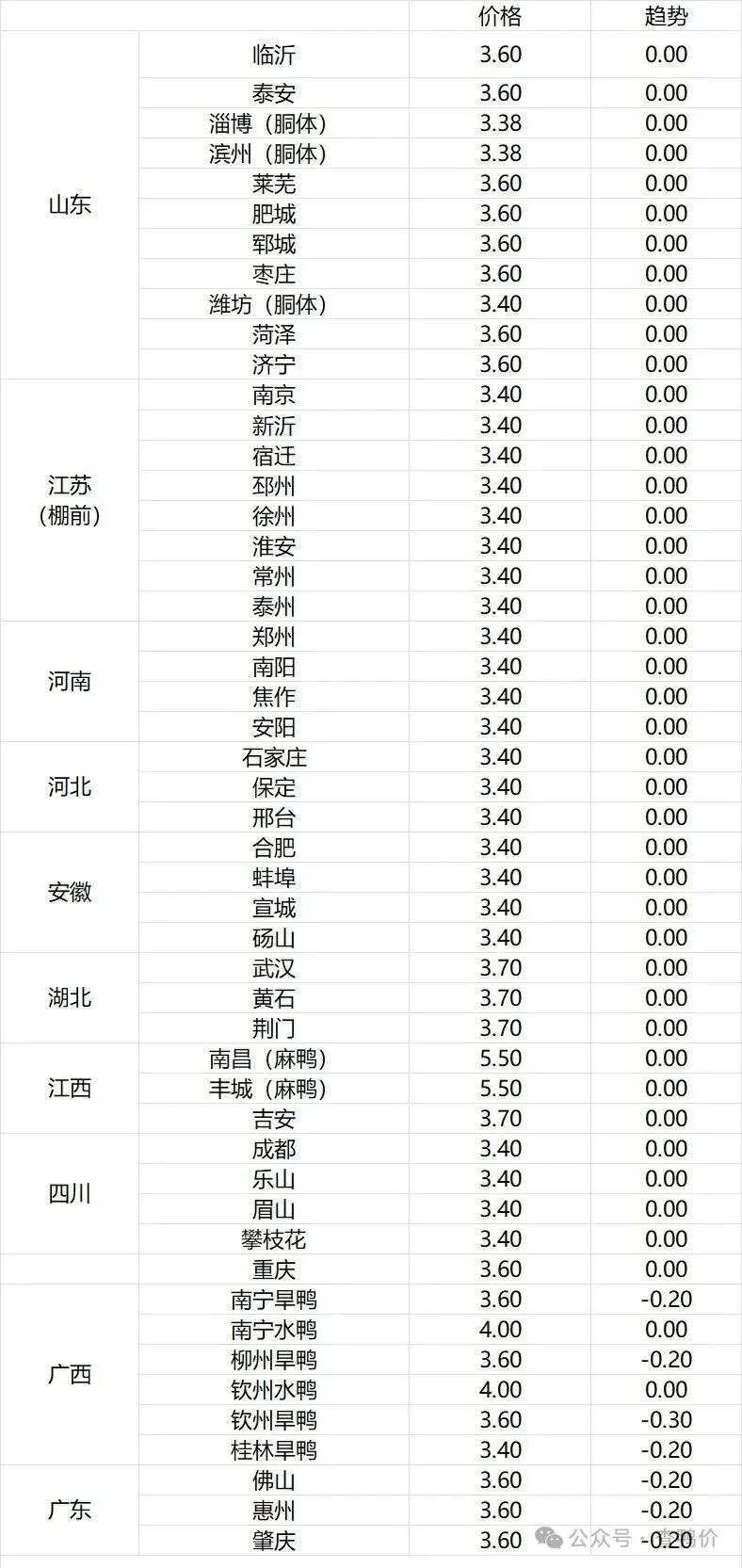 微评:鸭苗报价稳定。(注:南方只报当天价格)大厂控量保价,养殖端补栏情绪略有降温。根据产品、养殖成本及鸭苗现状分析,预计近期鸭苗价格呈震荡微调趋势。种蛋报价稳定。温馨提示:该价格为主流厂家报价,实际销售价格以成交价格为准,价格仅供参考。