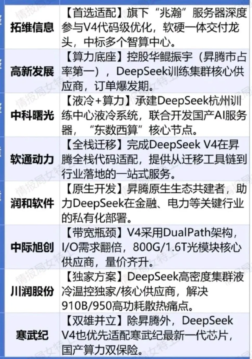 2、上周五DeepSeek-V4 的预览版本正式上线,同时开源。DeepSeek V4 将在华为昇腾 AI 处理器上完成适配和部署——国产大模型+国产算力的标志性组合,这是里程碑事件。华为随即第一时间宣布昇腾超节点全系列产品全面支持该系列模型。同时DeepSeek全系列API服务,输入缓存命中的价格降至原有价格的1/10,Pro模型在2026年5月5日前叠加2.5折限时优惠。当天GPU指数盘中直线拉升,截至午盘,海光信息大涨超9%、龙芯中科、中芯国际、通富微电、寒武纪、摩尔线程等个股纷纷跟涨。市场以最敏感的资产价格变化回应了这个时刻。黄仁勋前段时间访谈直言:如果顶尖AI模型被优先优化用于华为芯片而非英伟达平台,“对我们而言将是灾难性的”。