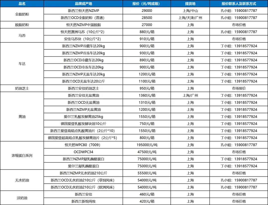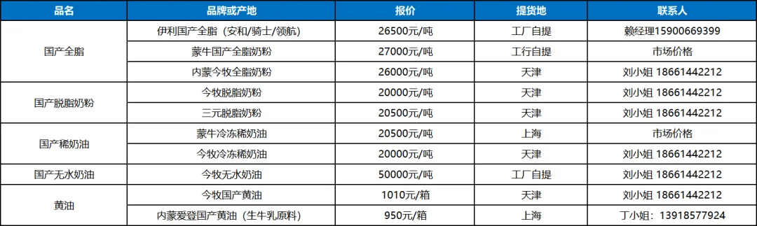 黄油:新西兰黄油受拍卖大跌影响,餐饮黄油大降110元每箱,工业品牌黄油不得不随之而下;国产黄油大受影响,主流价格逼近1000元/箱水平,二三线度日艰难。
