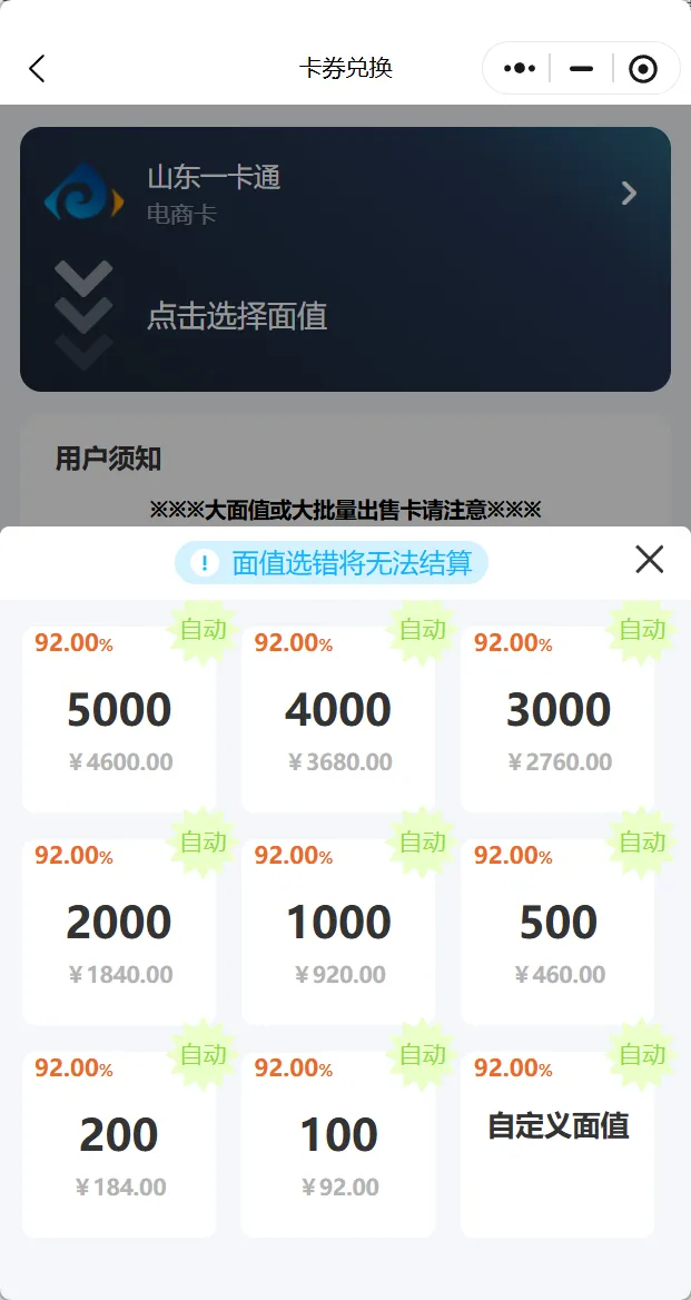 从团团收最新回收价格来看,当前山东一卡通回收折扣为 92.00%。对应金额也很清楚:5000面额回收4600元,4000面额回收3680元,3000面额回收2760元,2000面额回收1840元,1000面额回收920元,500面额回收460元,200面额回收184元,100面额回收92元,页面里还有自定义面值入口。