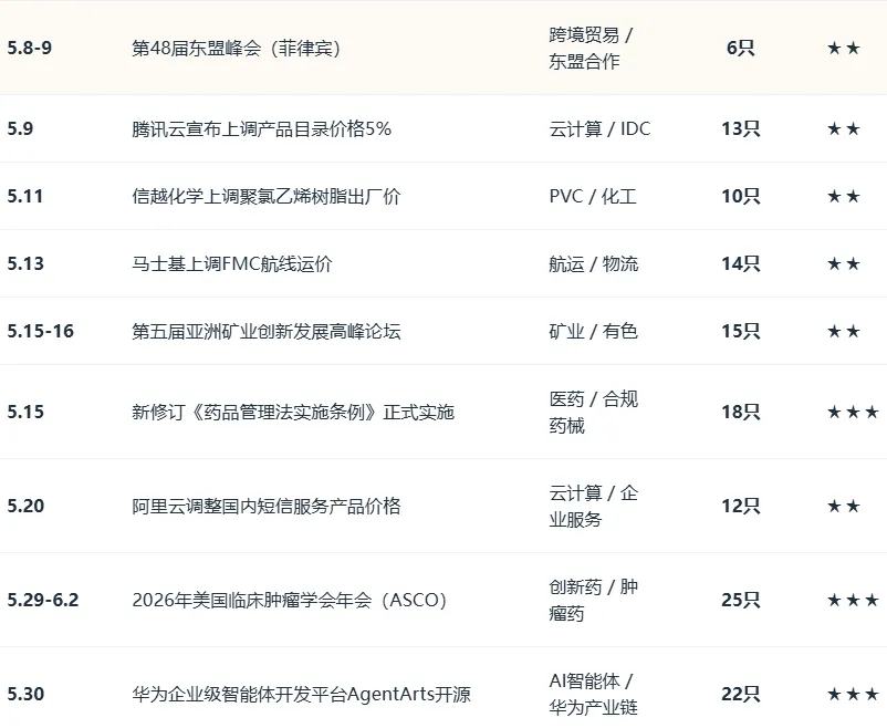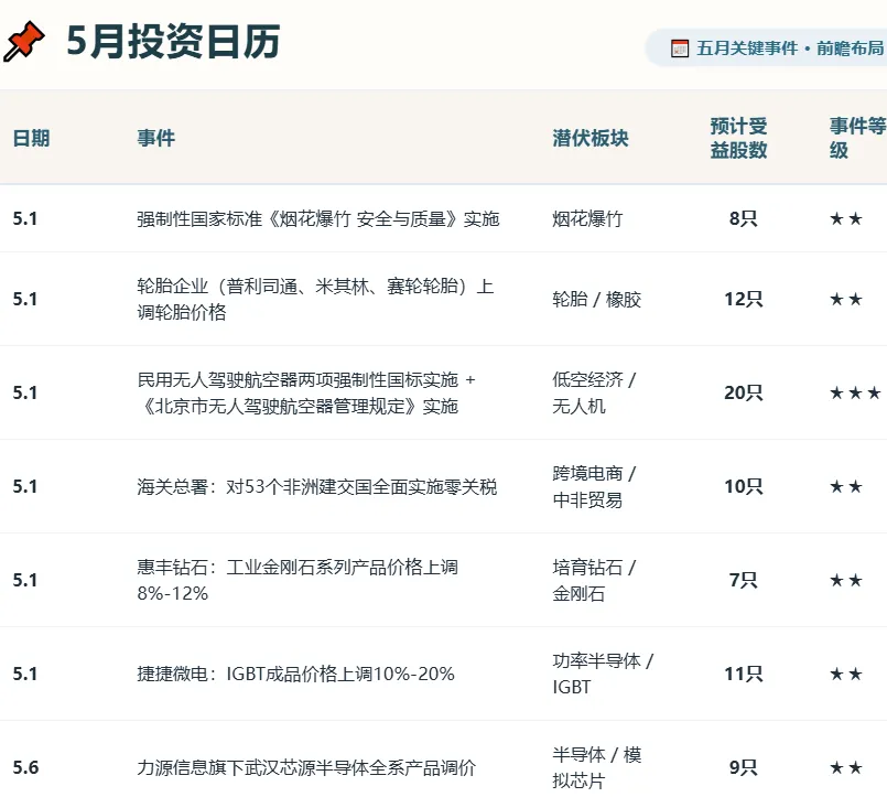 风险偏好偏低的资金,可提前筛选标的低位潜伏,等待事件催化发酵、板块异动拉升后,逢高冲高出货完成套利,这也是事件潜伏布局板块的核心意义。板块异动识别信号:优先观察板块内个股低位温和放量、分时小阳线堆量上行、板块资金净流入持续、龙虎榜出现机构 + 游资低位低吸布局、板块整体抗跌轮动先行,以上信号出现即可判定潜伏机会;反之个股提前大幅冲高、资金提前透支拉升,需警惕利好落地见光死。从这份 5 月投资日历来看,有三个方向最有机会被事件催化成阶段性主线: