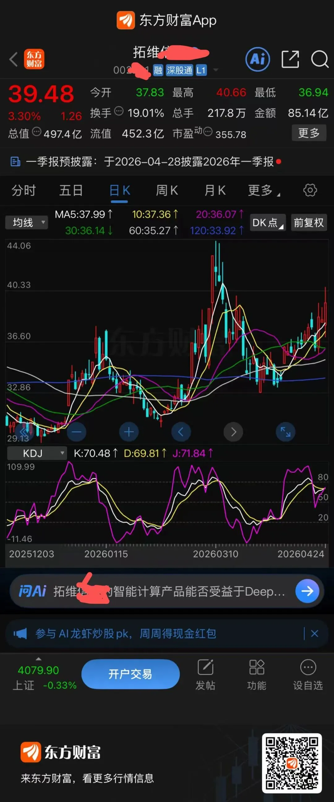 走势上处于震荡上涨阶段,目前反抽20日线,有向上迹象。3:拓维xx。DeepSeek— V4的上线,会大量使用华为昇腾950超节点,而拓维服务器是华为主要供应商之一。但基本面一般,可短线关注。