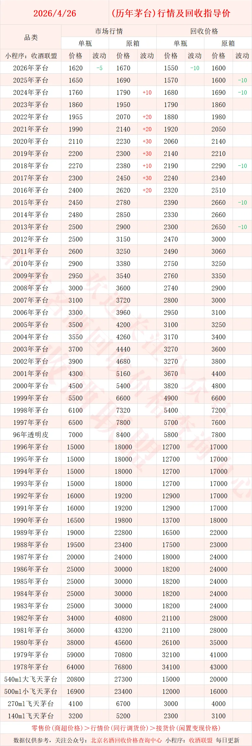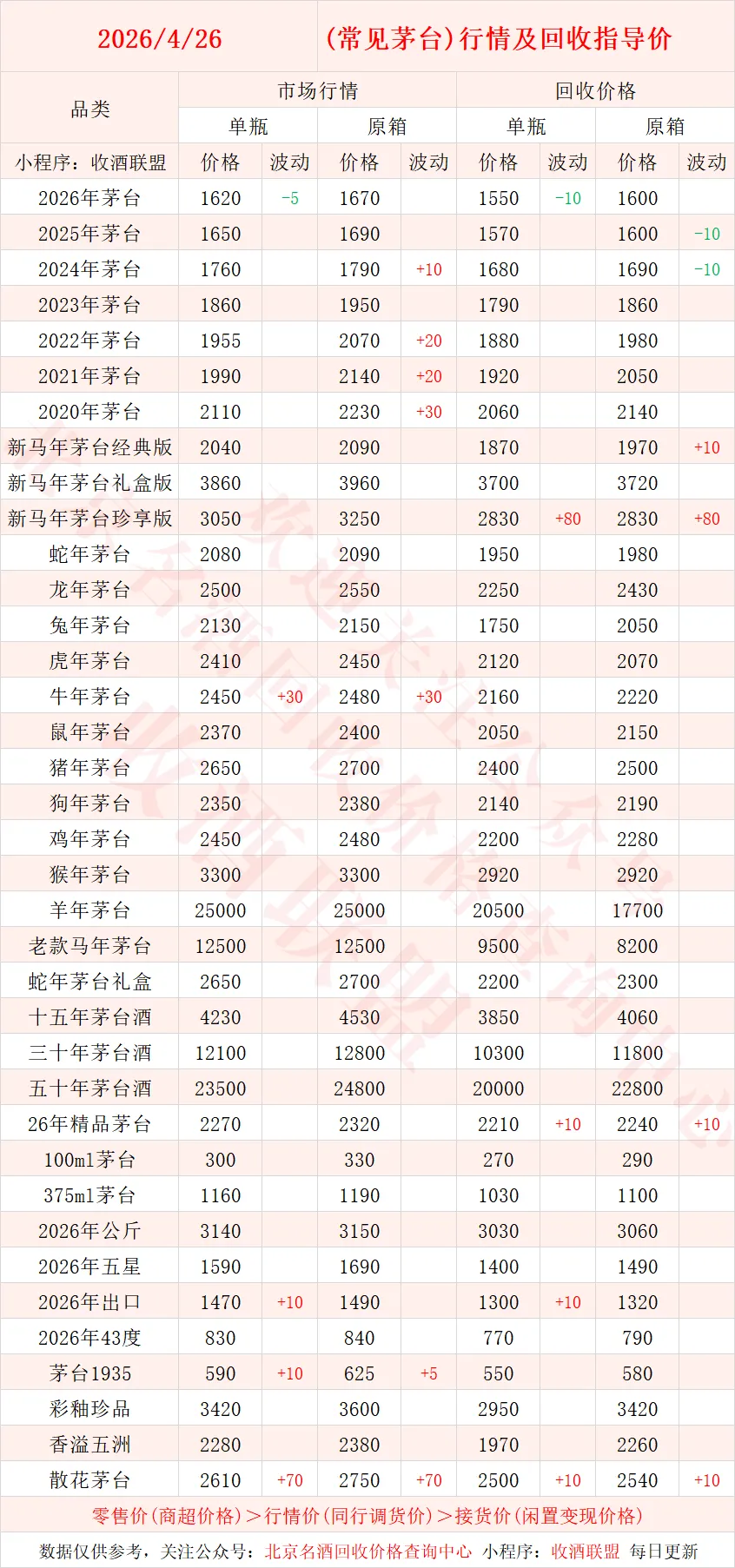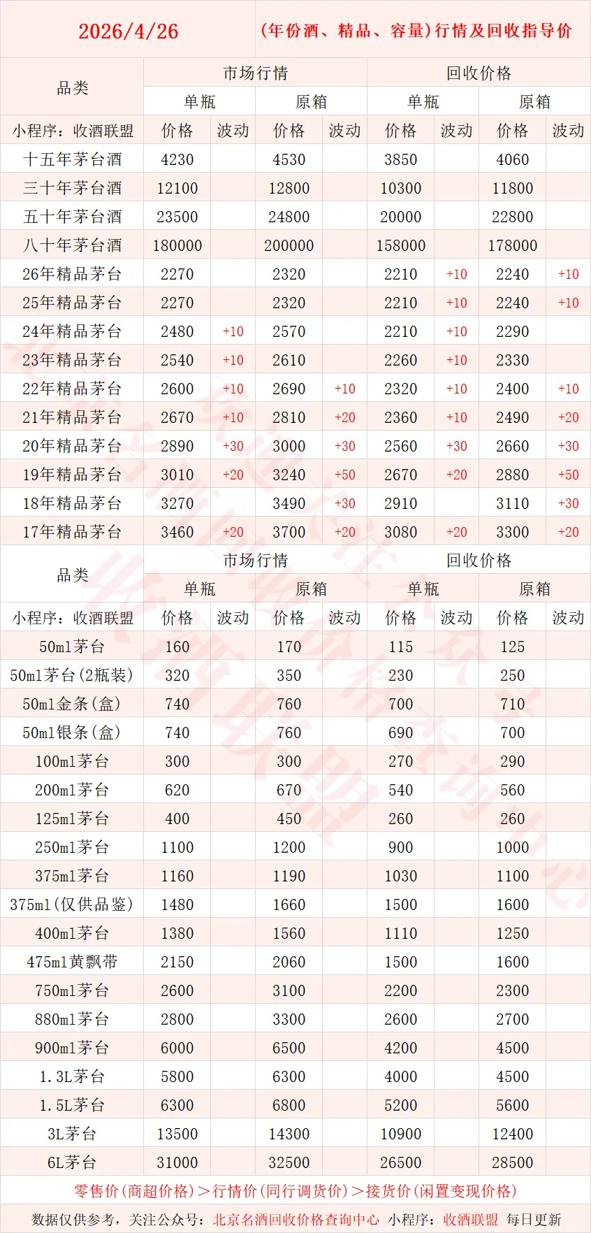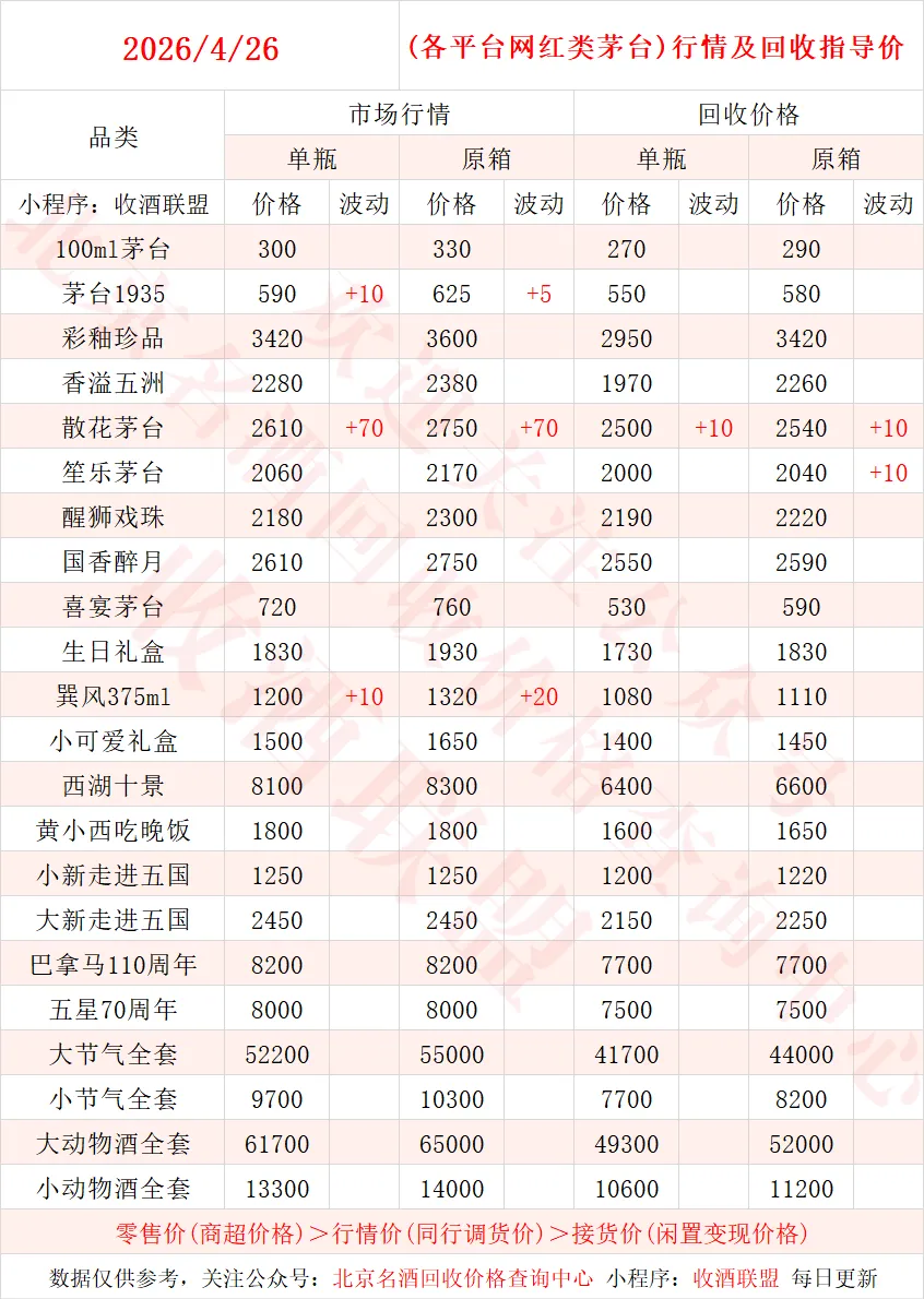 以下内容为,本公众号每日会及时更新的飞天茅台、生肖茅台、年份茅台,陈年茅台及不同毫升容量茅台的市场行情和回收报价;还包含五粮液、汾酒、剑南春、泸州老窖等国产名酒的行情及回收价,法国拉菲、木桐、玛歌等名庄红酒的回收报价,轩尼诗、马爹利、人头马等世界知名洋酒威士忌的回收参考价,每日整理不易,请点击关注支持。▪畅销类茅台行情及接货参考价▪