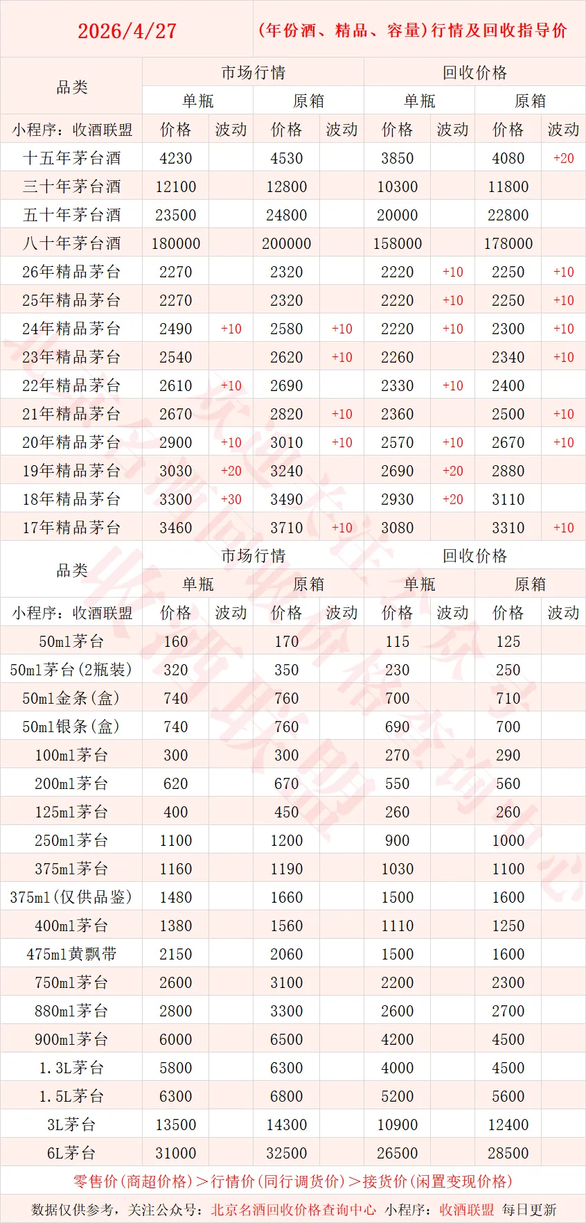 以下内容为,本公众号每日会及时更新的飞天茅台、生肖茅台、年份茅台,陈年茅台及不同毫升容量茅台的市场行情和回收报价;还包含五粮液、汾酒、剑南春、泸州老窖等国产名酒的行情及回收价,法国拉菲、木桐、玛歌等名庄红酒的回收报价,轩尼诗、马爹利、人头马等世界知名洋酒威士忌的回收参考价,每日整理不易,请点击关注支持