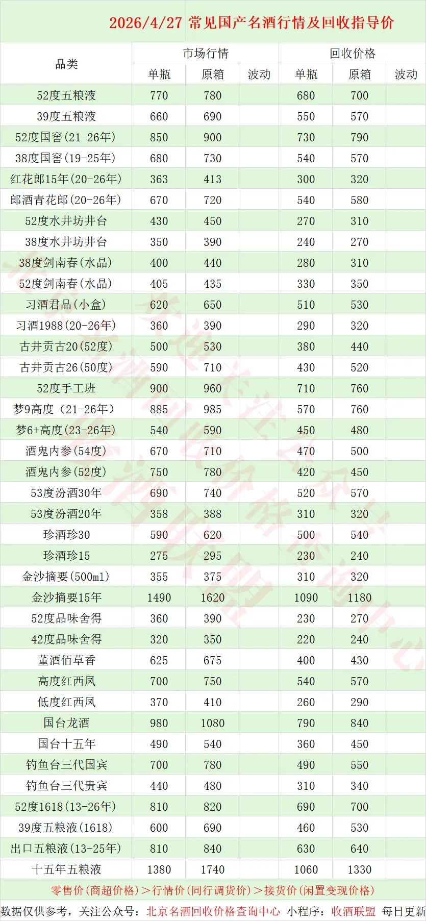 4月27日 茅台酒行情及名酒、红酒、洋酒一线回收参考价