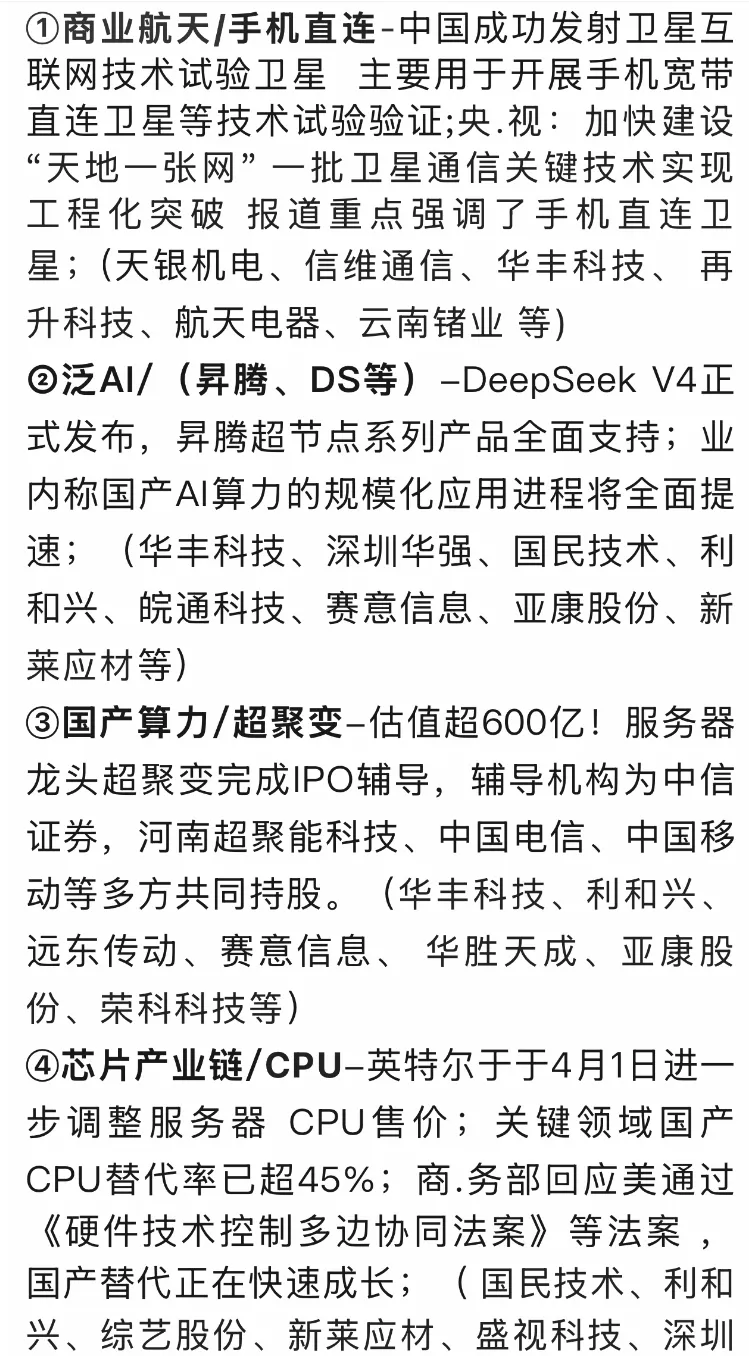 指数层面,波动加大,患得患失的人增多,指数还能不能涨? 再就是deep seekv4版本发布,对国产算力的带动预期增加! 还有美股科技很疯,对A股科技的带动预期也在增加,科技板块怎么弄?----那我们就开始聊一聊了! 目前中东的状态,仍然是A股修复行情重要隐患。特别是临近五一假期临近,总有人担心假期是否再次冲突,A股出现了部分避险心理,导致短期波动加大: 先看老美:4月21日,临时停火临近到期,在全球担忧战事再起的时候,川子果然怂了,宣布延期。4月22日,甚至直接驳斥“3到5天窗口期”的说法,强调“无时间压力”,给了停火无限期。---这个看整体上是按我们预期的不断延期进行的!唯一警惕的是,仍有三艘航母舰在继续保持战略威胁。----也就是保持威慑,但是不断拖延待变的状态。 阿郎则是更为理性,外长去了巴谈。但是继续释放各种强硬信号,比如保持战斗准备、准备好了霍尔木兹海峡的管理方案等。双方继续这么僵持。---小影响还有,但是除非再次完全干起来,否则大概率对A股的影响越来越小。 我们给大家一直强调,不要被市场带着自己的情绪、左右自己的节奏。而是要清晰的判断市场状态,才能从容不迫的应对! 第一个最好做的阶段,是从4月8日开启的修复,看看我们当时每天非常简单直接,就是干,就是做好修复。 现在是第二个阶段,特点是大的方向还是要继续修复。只是节奏没有前期上涨那么顺畅(a、因为获利盘太多,浮动筹码增加了波动;b、毕竟反弹220点了,再向上跨越前期高点,需要新逻辑)。---也就是短期震荡增加,大方向还能继续向上。 那短期怎么震荡?什么位置呢?震荡区间基本下沿10日均线附近(也就是基本在4050附近),保守下沿会在120日均线(也就是4010附近,如果有利空的时候会压到这个位置)。---基本就是回调两三天,就在这种关键位低吸!现在是低吸点,不是恐慌点! 所以周五周一附近低吸,后期高抛。短期这么高抛低吸,多点耐心,慢慢等待未来再次向上冲击4197上方! 判断对了指数,实际上更要作好主线才能有利润,这一波行情很邪乎就是科技涨,其他的真怂。 这两天轮动了白酒消费、电池、还有AI算力。目前我们还是集中在AI算力等科技方向,cpu半导体等科技预期,再有一个就是电池,就这几个为主。 这次一个要先说Deep seekv4大模型,这个东西还是很超预期的,对A股有一定带动性。很多人说这个东西有什么牛的?1)参数干到了1.6万亿,是什么概念?两年前大家还在为千亿参数欢呼,如今参数规模直接膨胀了一个数量级。2)更牛的是,这么大的参数不是全部使用,而是每次只调取自己需要的数量。比如,你只问一个眼科的事情,他就只调取这么多,其他的数据可以休息。---也就是很合理的节约;3)文本调取量,1M(100万)Token的上下文长度,将是Deep Seek所有官方服务的标配。要知道,这些是老美很多专业的大厂才用的起,我们这都标配了。---你就这么理解,自己牛,还便宜。 对资本市场会带来什么呢?一个就是deep seek概念股的活跃;一个是国产算力的适配,导致需求增加,昇腾,其他算力等细分都有预期。周五有点异动的,深华强、拓维、皖通科j、浙数纹化等等。 我们认为算是一个重要部分,大家可以看看下面的产业链,认真梳理一下。 最近美股也是真猛,英特尔这次业绩很超预期,周五直接涨了23%,AMD更是4月份以来持续向上干了68%。英特尔首席执行官陈立武表示,伴随着AI工作负载重心从训练转向推理,推动CPU和GPU之间的比例关系平衡,从1:8 向1:1转变,带动CPU需求激增。也就是除了去年的GPU,这次cpu相关的也要注意了,A股的海光x息、寒武j等都有异动。 关键是英伟达这一次也很猛,大概率A股的科技逻辑又要继续被带动了。国产cpu逻辑、半导体逻辑产业链重点企业,我们给大家整理了一份研报。这个方向是重点!电池:多家机构数据显示,锂电行业5月订单与排产在4月高基数基础上环比再度提升,产能利用率已达8-9成。下游需求持续旺盛,推高碳酸锂价格自2025年底的11.73万元/吨回升至4月23日的17.19万元/吨,涨幅达46.61%。盘面上,天华新㴰、天齐锂、江特d机、西藏矿y等相对活跃。---这个方向,算是除了AI算力和科技之外的一个重要的方向。 板块上的观点就是:我们还是在AI算力、CPU等科技为主,还有电池、半导体等板块做搭配,还有航天、创新药、电力作为第三层的搭配。---这波行情真是极端,就是这些抱团向上,坚定主线好好做!总结一下吧:最好的阶段是4月8日开启修复行情,黄金坑带来的机会最确定!现在进入第二个阶段,虽然大方向还是继续修复,但是比以前震荡增加了很多!---这个阶段要不断高抛低吸,度过这波震荡期,再向上涨! 看清方向和节奏,保持自己的节奏,必然会获得好的效果。切忌被市场的杂音扰动,那样会涨了看多,跌了看空,会很杂乱。相信春暖花开的季节,更多人会有更加丰硕的收获!【免责声明】任宇腾 A0670625030023 云南约牛软件技术有限公司 ,以上所有内容仅仅为信息梳理,不作为买卖依据,据此操作,风险自负!!快手直播:三箭齐发谈股论道宇腾 每天上午10:45分开始!!