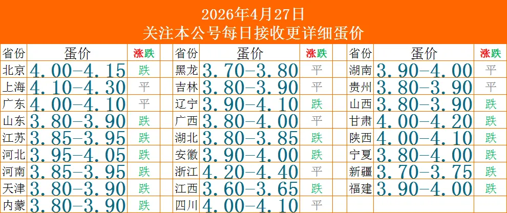 截至2026年4月27日,全国鸡蛋价格整体呈现稳中有落、区域分化态势,主产区批发均价约3.81元/斤,较本周高点回落明显,五一备货进入尾声,市场交投转淡。农业农村部监测显示,全国批发市场鸡蛋均价约8.49元/公斤,近期小幅波动。分区域看,华北产区山东、河北主流报价3.9–4.0元/斤,局部走货放缓微跌;华东江苏、安徽稳中有涨,均价3.9–4.0元/斤;东北辽宁、黑龙江价格偏低,维持3.7–3.9元/斤。主销区北京、上海、广东零售价4.1–4.4元/斤,较产区高出0.3–0.5元/斤,主要受物流与仓储成本影响。当前市场处于五一备货收尾阶段,终端需求放缓,贸易商库存低位,多随采随卖。供应端,蛋鸡存栏仍处高位,新开产蛋鸡陆续补量,叠加老鸡淘汰节奏平稳,短期供应压力不减。需求端,食品厂、商超备货基本结束,居民消费趋于理性,高价接受度下降。业内预计,短期蛋价将维持窄幅震荡,上涨空间有限。4月28日后需求或进一步回落,南方梅雨临近,鸡蛋储存难度增加,贸易商谨慎心态加剧,蛋价或偏弱运行;五一后随终端消费短暂提振,不排除小幅反弹可能,但整体幅度受限。仅供参考!