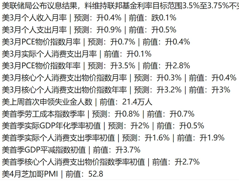 5月1日(星期五)美4月标普制造业PMI终值|初值:54美4月ISM制造业PMI|预测:53.3|前值:52.7美4月ISM制造业物价支付指数|预测:82|前值:78.3美4月ISM新订单指数|预测:55|前值:53.5