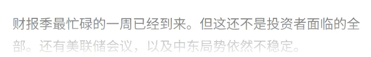 - 政策连续性预期:迅速回归至美联储利率决议(周三29日)科技股财报季。
