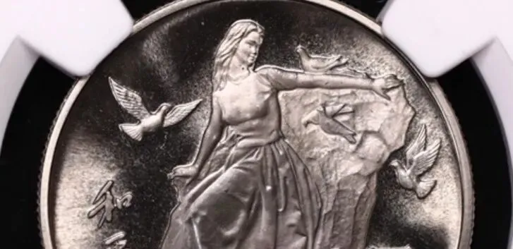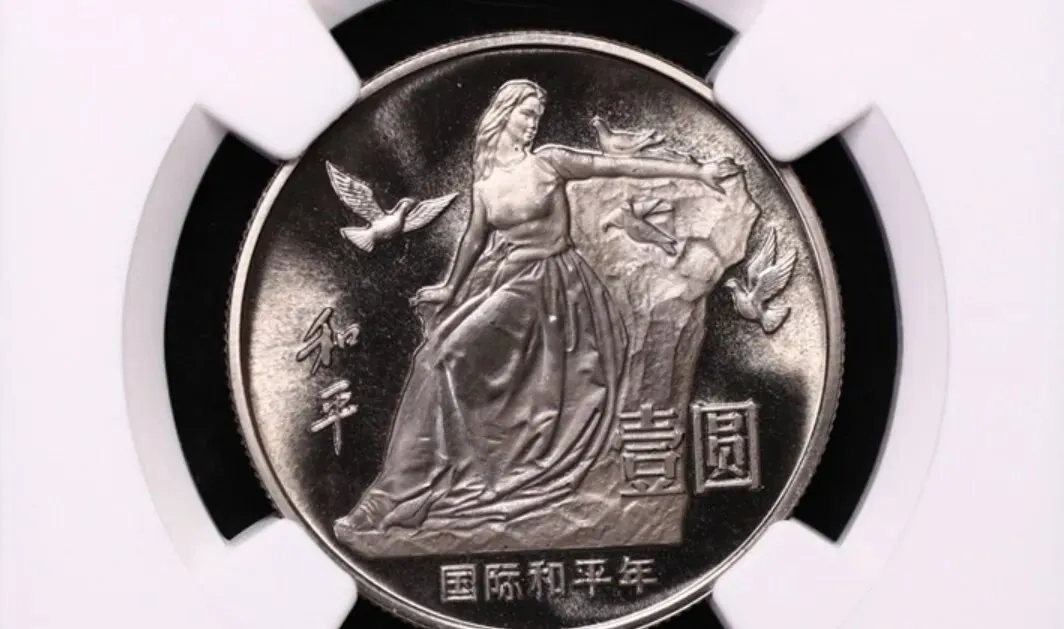 图中这块就是1986年“和平年”精制币的正面,最招眼的一笔,是那个盘坐在岩石上伸出胳膊的女子,周围一群和平鸽展翅翱翔,正面右下角一串“壹圆”字样,刻得方正,边上还有“和平”俩楷体字,底下小字写着“国际和平年”,镜面镀层的反光下,整块币子像新出水的钢板,老钱币圈里也管它叫“肥鸽版”,说的是那个鸽子的身形比普通版胖一圈,翅膀轮廓也圆润得多,看一眼不容易忘。