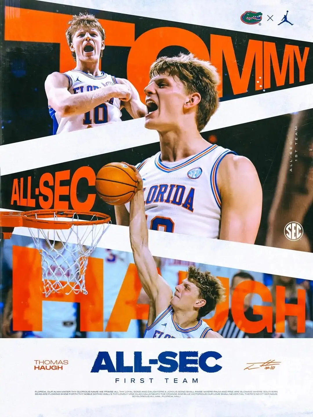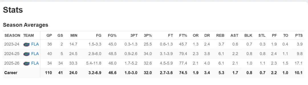 在去年随队夺冠后,托马斯·霍大三赛季迎来质的飞跃,个人场均数据来到17.1分6.1篮板2.1助攻1.1抢断1.0盖帽,入选SEC联盟第一阵容及全美最佳阵容二阵。