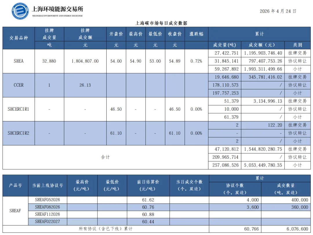 截至今日,上海碳市场所有现货品种累计成交量257,086,526吨,累计成交金额5,053,449,780.35元。其中,配额累计成交59,267,892吨,成交金额1,993,311,499.66元;CCER累计成交197,757,253吨;SHCERCIR1累计成交61,379吨;SHCERCIR2累计成交2吨。上海碳配额远期产品累计成交数量6,076,600吨。