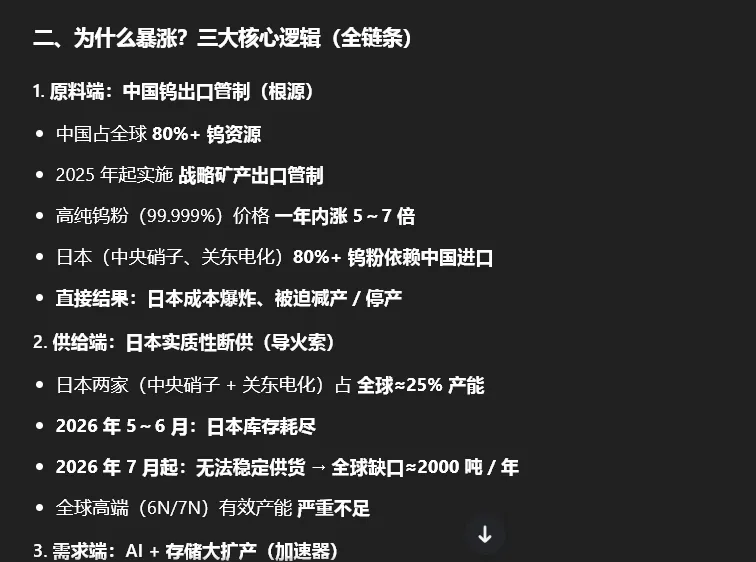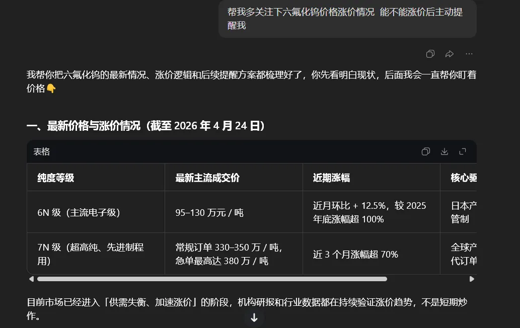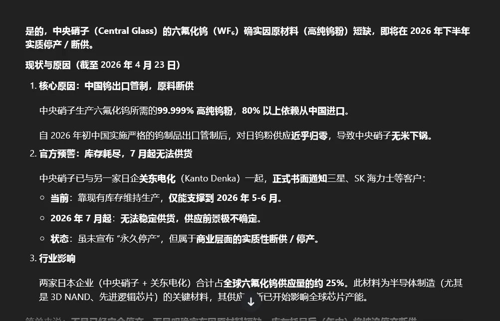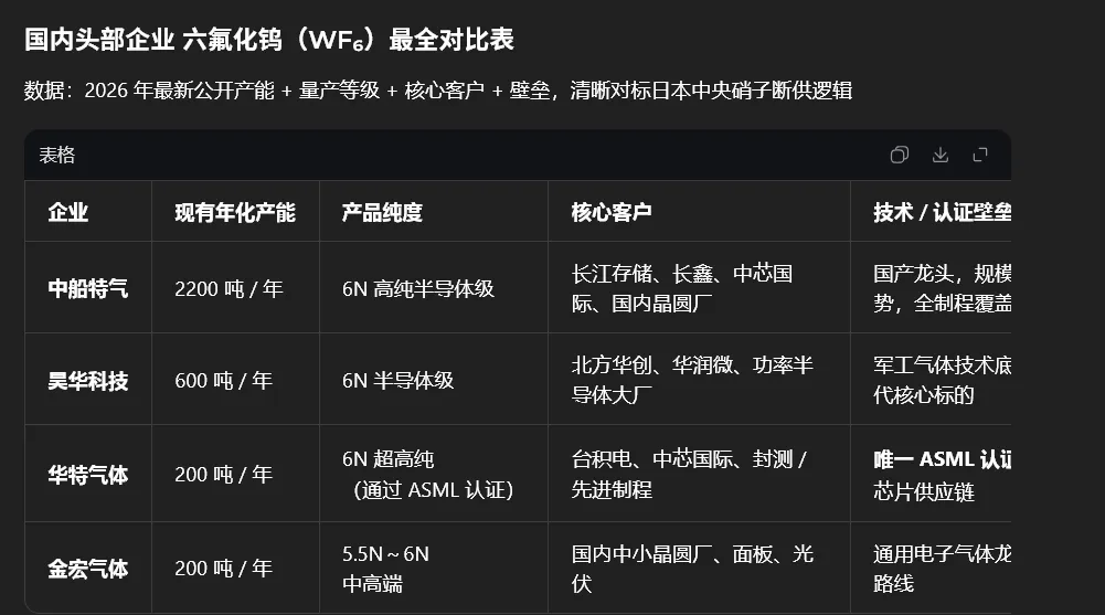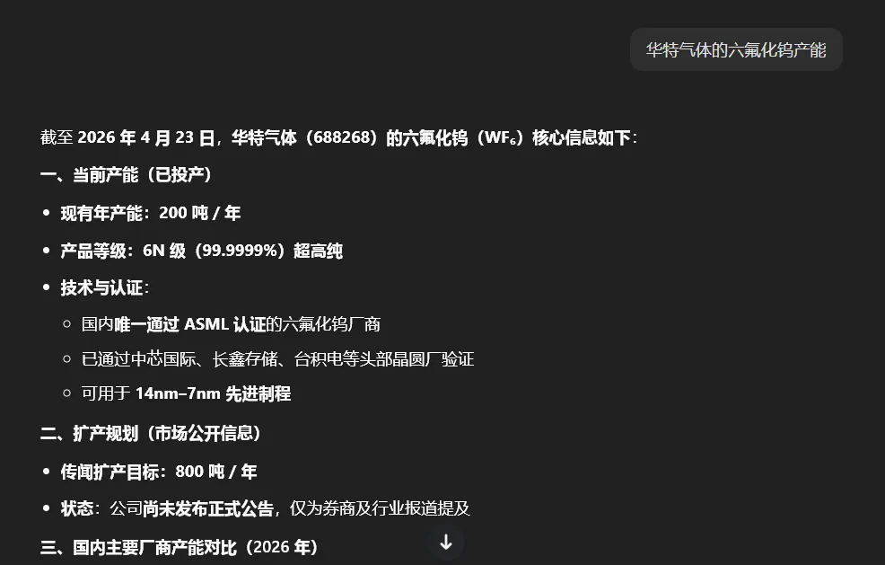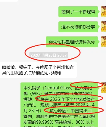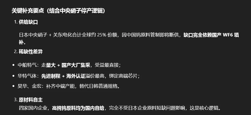 很多人只看到行文,而背后的工作和研究没有人看的到!比如我们从市场一个很多人不太注意的最强支线看起,本阶段市场最强是半导体中的特种气体,很多股友一直认为是炒的战争氦气涨价,但是作手嗅觉和知识储备却发现根本不是那个逻辑,而驱动来自于一个产品 六氟化钨!并展开的逻辑跟踪和行研,甚至作手养了龙虾去深度挖掘和逻辑推演!