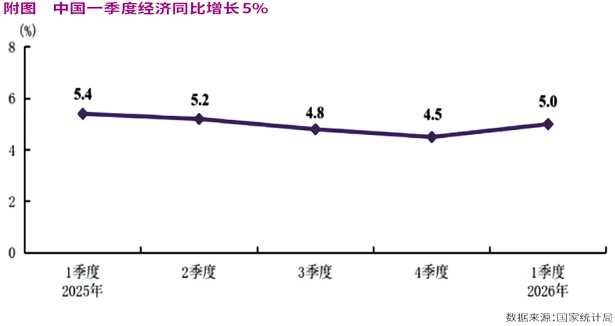国家统计局公布的数据显示,一季度国内生产总值GDP(按不变价格计算)同比增长5.0%,比上年四季度加快0.5个百分点;环比增长1.3%,为2025年以来最好的季环比水平。一季度,全国规模以上工业增加值同比增长6.1%,比上年四季度加快1.1个百分点;社会消费品零售总额同比增长2.4%,比上年四季度加快0.7个百分点;全国固定资产投资(不含农户)同比增长1.7%,上年全年为下降3.8%;货物进出口总额同比增长15.0%。