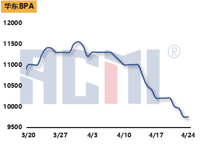 价格方面:上周双酚A市场价格继续下滑:截至4月24日,华东双酚A参考价格在9750元/吨,较上周价格下跌400元/吨。