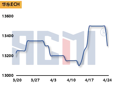 价格方面:上周环氧氯丙烷市场价格下跌:截至4月24日,华东市场环氧氯丙烷参考价在13300元/吨,较上周价格下跌200元/吨。