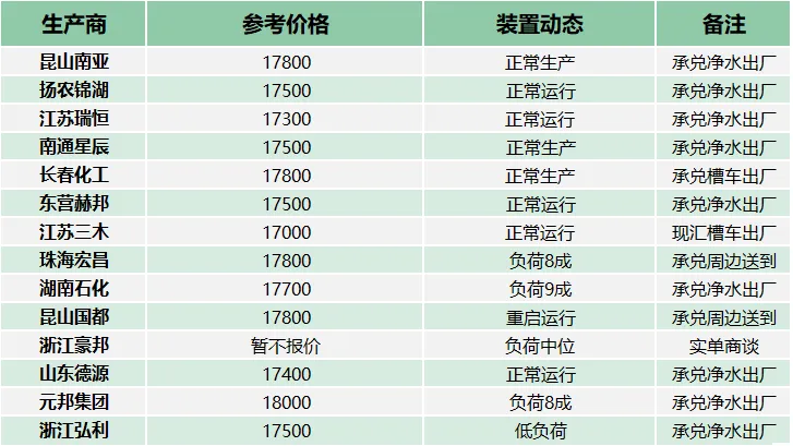 原料方面:丙烯最新参考价在9500元/吨,较上周价格上涨150元/吨;液氯最新参考价在460元/吨;华东99.5%甘油最新参考价在10650元/吨,较前一周价格下跌100元/吨。