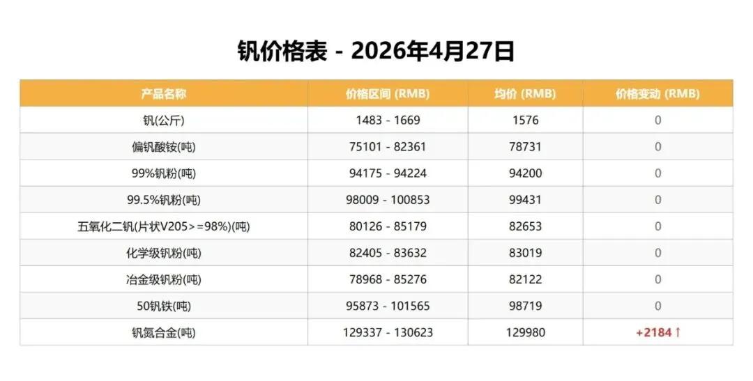 今日钛产品市场多数持稳,仅钛合金锭价格出现上涨,其余品种均无变化。钒产品市场同样表现平稳,仅钒氮合金价格小幅走高,其他品种保持不变。整体来看,两个品种均以稳定运行为主,个别品种有所回暖。下游采购仍以刚需为主,交投氛围较为清淡。短期价格走势或延续分化态势。钒荣网旨在汇聚钒钛产业链上下游企业,钒荣网将通过资讯浏览推送、“双碳”产业、在线交易推广、技术成果转让、产业金融、钒产业指数、行业标准会议会展、咨询服务数据报告等功能板块,为钒储能上下游企业提供商机对接、行业资讯、产业金融、市场拓展、名企研学、品牌宣传、数据服务、专属顾问等服务。